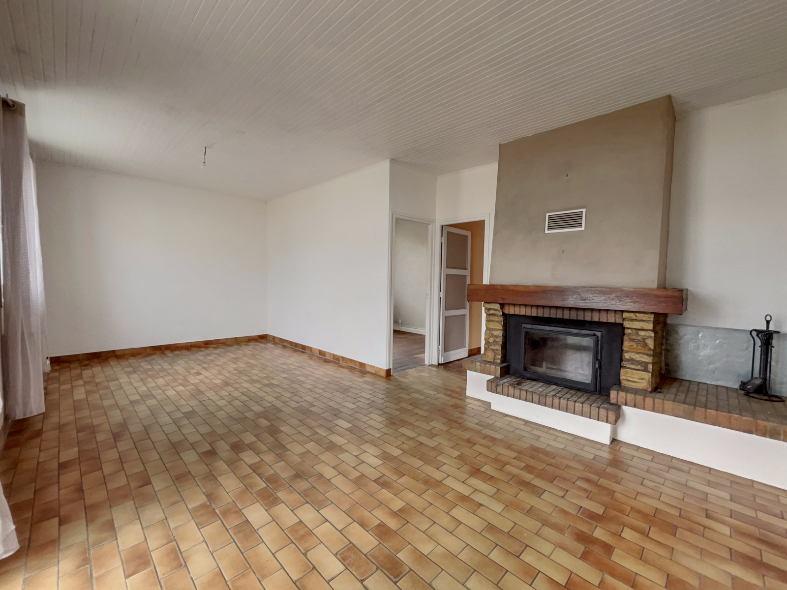 Le salon et la salle à manger forment une grande pièce à vivre, agrémentée d'un beau foyer fonctionnel, créant une ambiance chaleureuse et conviviale.