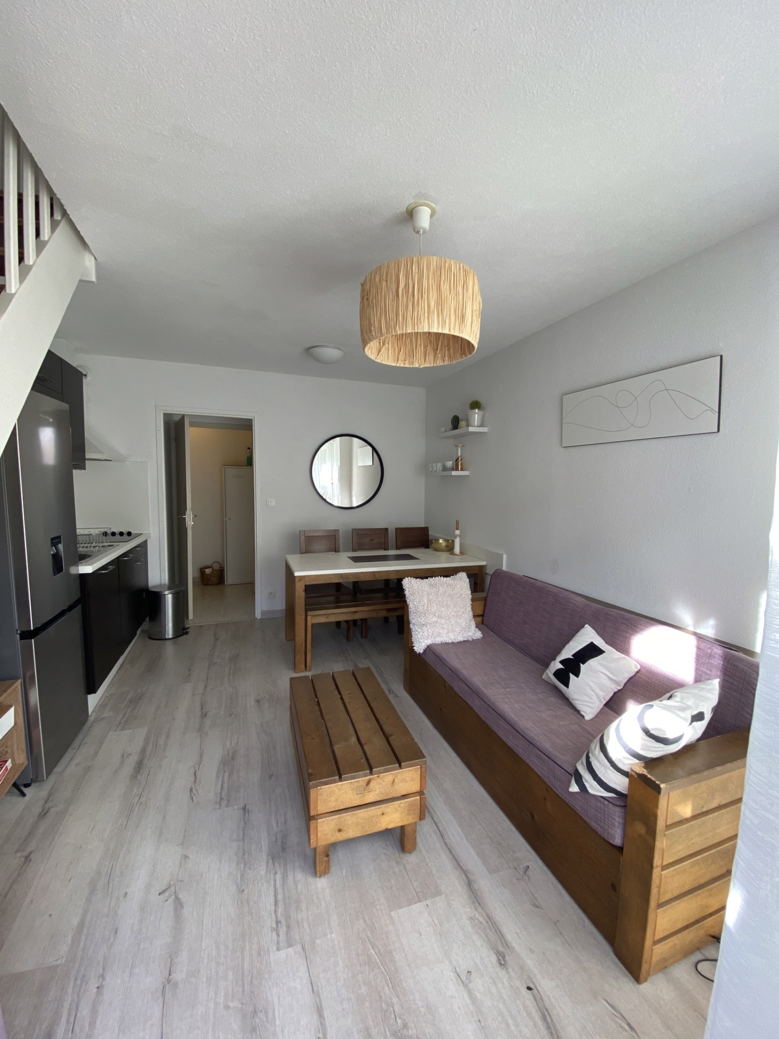 Au rdc se trouve le séjour avec son canapé convertible, la cuisine ouverte toute équipée, une grande salle de bain et les WC.